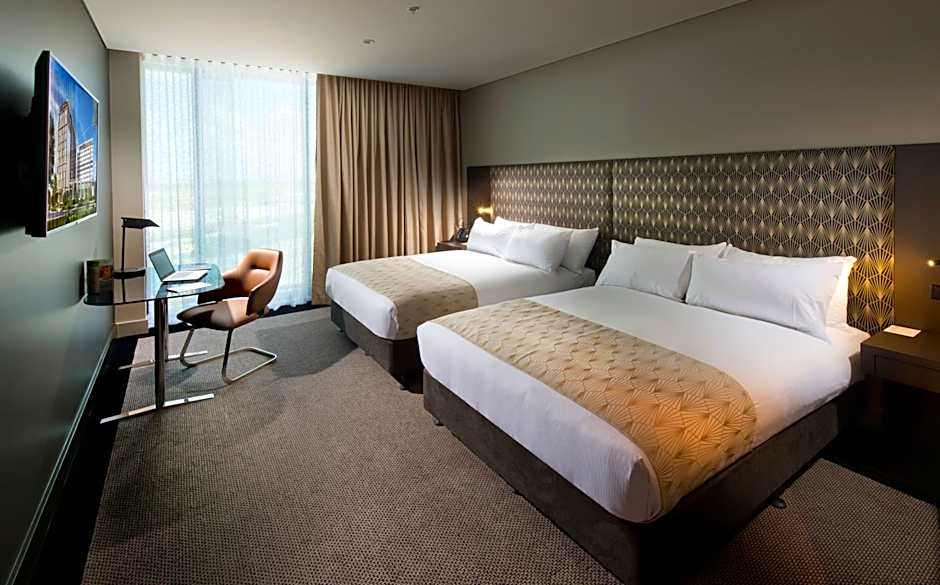 Located on a higher floor, offering stunning views towards Moreton Bay, Brisbane CBD, Brisbane Airport and beyond. It has 2 innovative Pullman feather double beds and pillow menu feature alongside a 50-inch LCD TV, mini Nespresso machine, deluxe mini bar, lounge, desk, in-room safe, spacious marble bathroom.